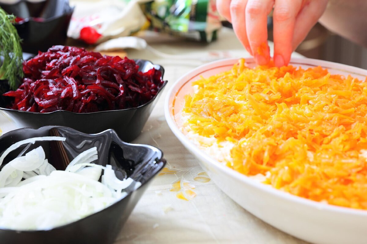 Если привычный салат «Сельдь под шубой» порядком наскучил, приготовьте интересную альтернативу – салат «Лисья шубка». В нем сочетаются продукты, которые ранее вы вряд ли пробовали сочетать. И, будьте уверены, их тандем наверняка придется по вкусу каждому. Тем, кто следит за калорийностью питания, стоит ограничить размер порции. Но попробовать все же стоит, ведь маленькие поблажки на праздники всегда приятны. Салат «Лисья шубка» Наверняка, многие задаются вопросом происхождения названия этого блюда. Прежде всего, такое название оправдано по причине последнего морковного слоя. Яркий оранжевый, он напоминает шубку лисицы. Чтобы цвет оставался насыщенным, не покрывайте морковный слой тонкой сеткой майонеза. В салат «Лисья шубка» используют грибы лисички. Но ввиду их не столь широкой доступности, более популярными стали шампиньоны для приготовления салата. Грибы используют жаренные. Если вам нравится пикантность маринованных, смело заменяйте грибами из маринада. Подготовьте: Очередность при