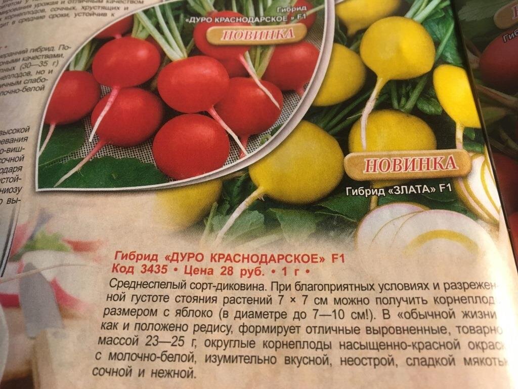 И все-таки настоящим огородникам неймется. Хотим чтобы была белая редиска, желтая, синяя, серо-буро-малиновая. Потому что красная — это уже скучно. Но хорошо, что таких пытливых исследователей все-таки меньше. Тех, кто готов чисто из спортивного интереса сажать много новинок, чтобы потом рассказать остальным, что же из этого получилось. Выросла ли размером с яблоко редиска сорта Дуро Краснодарское или желтый гибрид Злато. Вот и я. Обещала весной рассказать про то, как уродится у меня белая редиска. И пусть немного с опозданием, но выполняю свое обещание. Итак, весной я купила два пакета разноцветной редиски. И немного меня удивило, что редис с названием «Шесть цветов» продавался в пакетах из серии «Классика», посмотрите: Все-таки, если уж говорить про классику, то тут придется вспомнить явно другие сорта: Жара, Французский завтрак, Охотский... Ну сложно называть классическим вариант белой или синей редиски. Но меня заинтересовала надпись: «Три цвета — три вкуса», вот на этом пакете: Оч