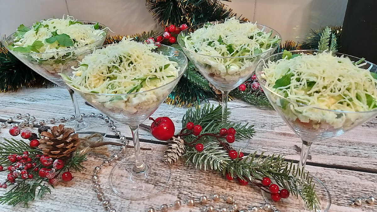 Привет, друзья! Сегодня поделюсь с вами рецептом очень простого и вкусного салата на праздничный стол. Готовится он всего из трех основных ингредиентов, а необычная подача не оставит никого равнодушным. Для приготовления нам понадобится 📖Ингредиенты: Копченую грудку или окорочок весом 300 - 350 грамм. нарезаем мелким кубиком. Затем 3-4 вареных яйца нарезаем мелким кубиком. Я это буду делать при помощи вот такого ситечко для салата. Один или несколько свежих огурчиков натираем на терке для корейской моркови или нарезаем мелкой соломкой. Затем натираем на мелкой терке 40 грамм сыра. Затем небольшой пучок петрушки измельчаем ножом. Когда подготовили все ингредиенты, приступаем к сборке салатика. Я буду собирать салатик порционно вот в таких бокалах для Мартини. Вы же можете собрать салатик в креманках или в обычном салатнике. Первым слоем выкладываем подготовленную копченую курицу. Делаем небольшую сеточку из майонеза. Как приготовить вкусный домашний майонез? Если кому-то интересно с