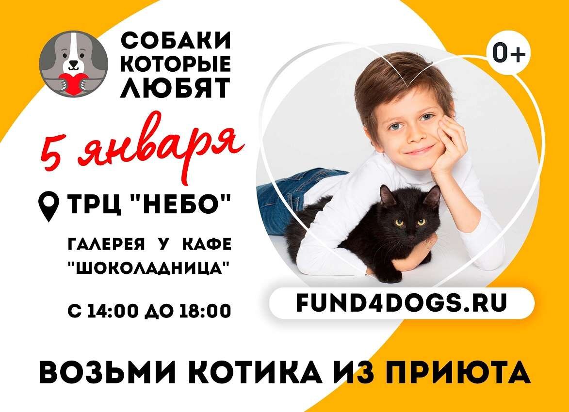 5 января фонд «Собаки, которые любят» приглашает москвичей в ТРЦ «Небо» в Солнцево на добрую новогоднюю выставку котиков из приютов, которые мечтают о доме и любящем хозяине. Выбрать друга и забрать его к себе можно по договору об ответственном содержании. Волонтеры помогут в выборе, расскажут об особенностях характера каждого котика, а партнеры мероприятия вручат полезные подарки для первых дней дома.