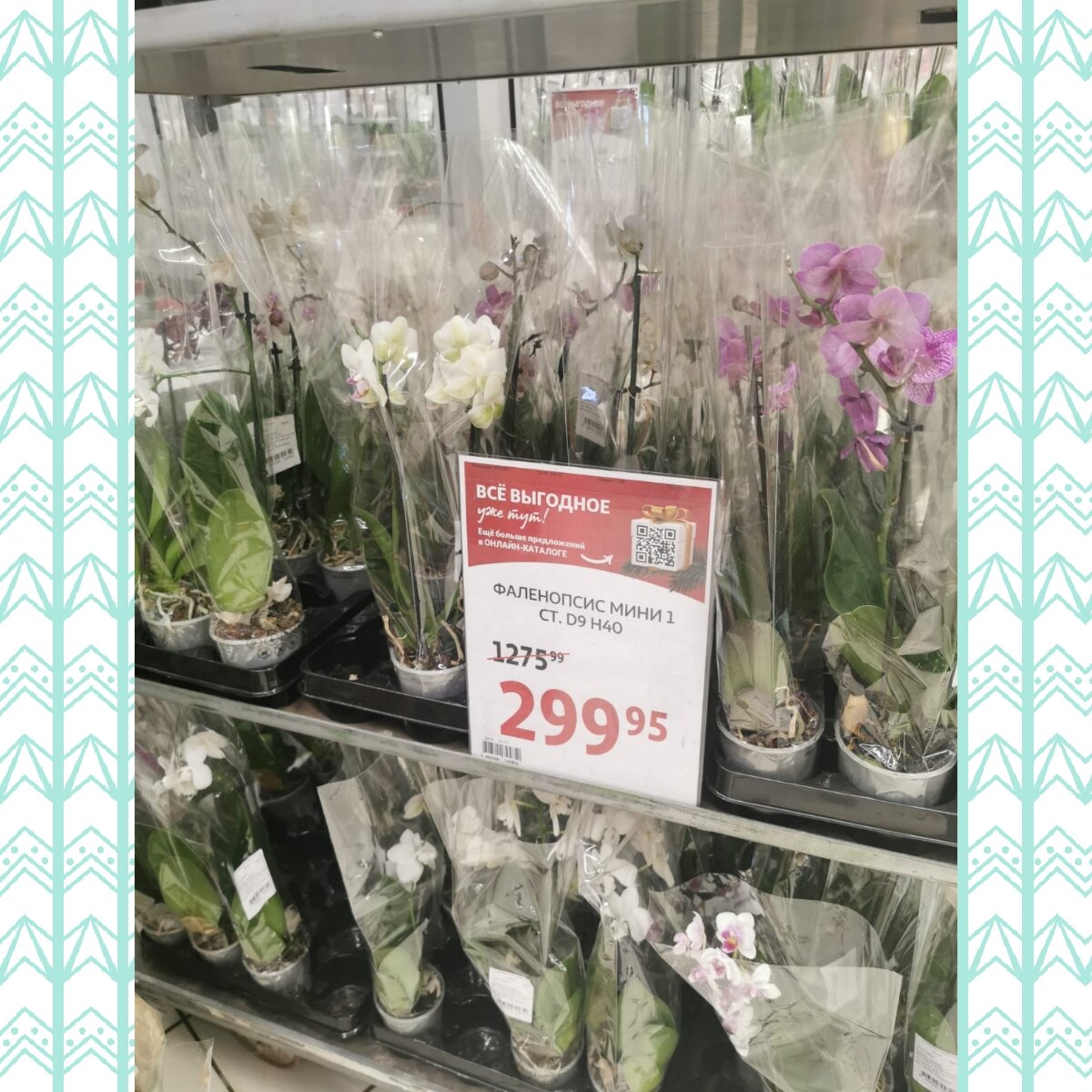 Эта моя цветочная прогулка должна была быть длинной, но получилась короткой, потому что я посетила только окрестные магазины - два штуки. Однако рассказ о ней получился длинным. В "Ашане" я не планировала навещать цветочки, но увидела цену на орхидеи... И пошла их рассматривать. Всего штуки четыре тролля с орхидеями в размере миди (на них почему-то написано "мини") и стандарт по цене 299,95 рублей. И никакого ажиотажа вокруг них... Я уже несколько месяцев не понимаю, что происходит с ценами на орхидеи в России. Почему вдруг цена на них сильно снизилась после введения санкций на ввоз растений в РФ? Половина орхидей стояли залитые водой, в поддонах плескалась вода. :( Остальные залить не успели, и еще можно было выбрать симпатичные цветущие растения с просушенными хорошими корнями. И я таки выбрала одну орхидеечку для себя. :) На соседнем стеллаже обнаружила оторванца, воткнула его в грунт в горшок с таким же растением. На следующем стеллаже увидела странное. Мотивацию автора этой идеи,