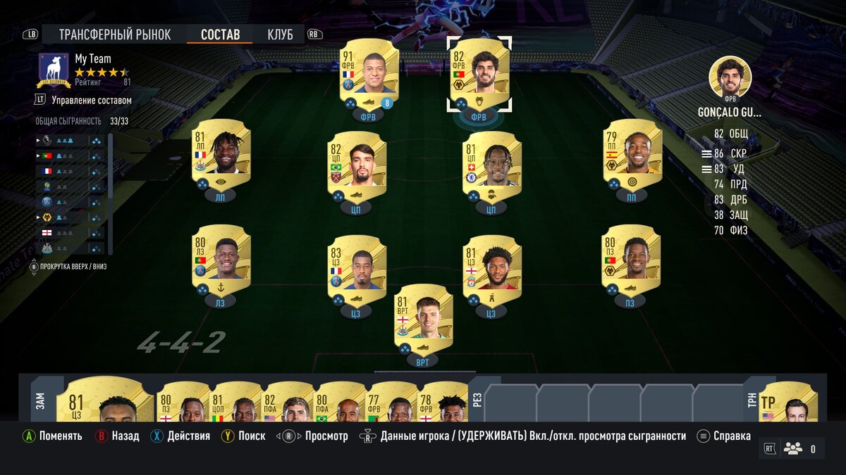 Ваш состав – ключевое меню Ultimate Team. Вы будете постоянно менять игроков, но для старта нужна стратегия. Покупайте быстрых игроков и ориентируйтесь на показатели, которые цените больше всего. Рейтинг важен, но медленные звезды ослабят команду.