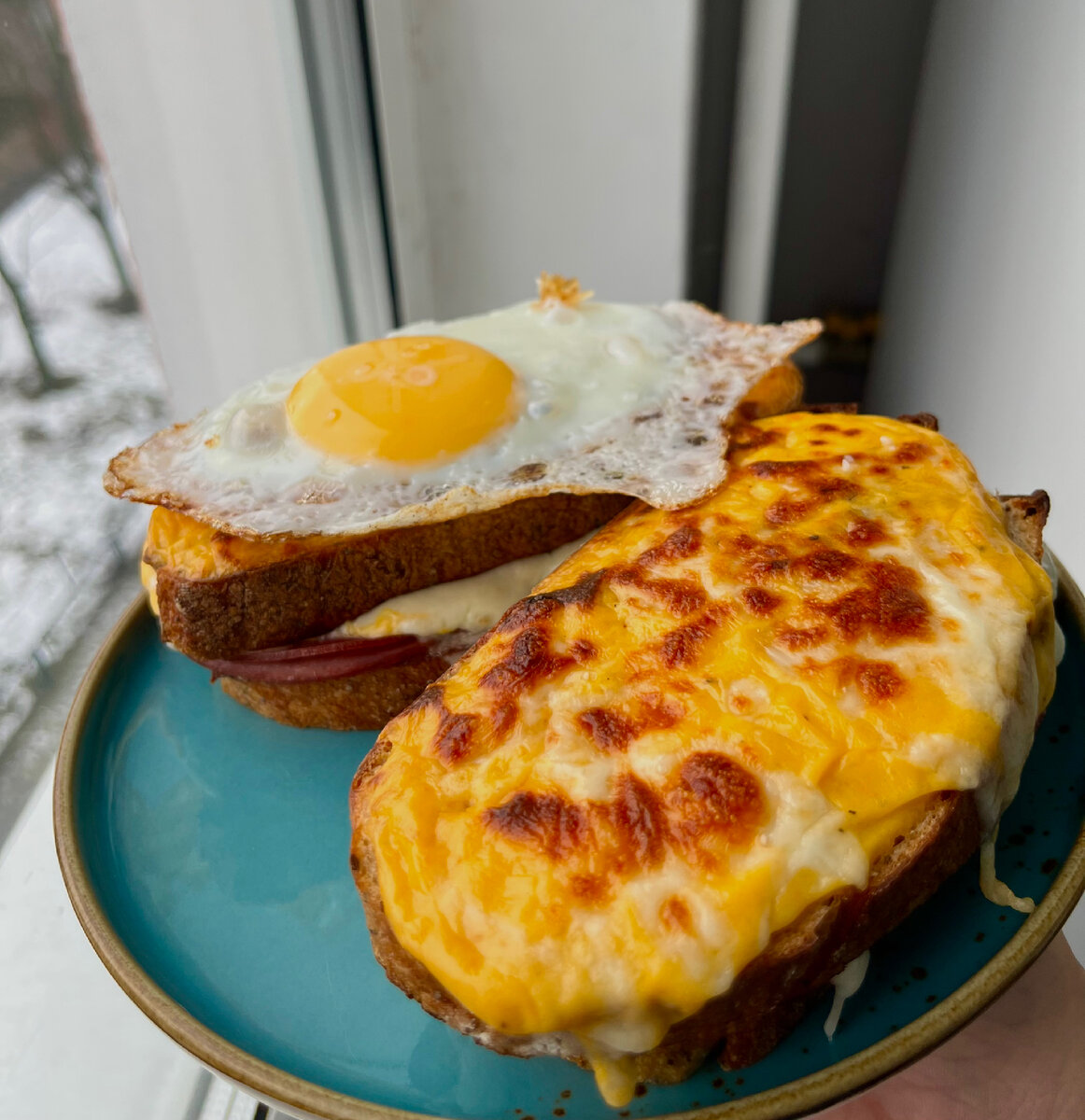 Сегодня у нас два горячих, очень сытных и очень сырных сэндвича родом из Франции - крок месье и крок мадам. Отличный вариант позднего завтрака в выходной, когда все проснулись после полудня. Такой себе завтракобед. Единственное отличие месье от мадам - в яйцах, и, внезапно, яйца тут отнюдь не у месье, хотя казалось бы. Жареное иичко верхом на сэндвиче должно напоминать вам дамскую шляпку, так что мадам - это как раз та, что с яйцами. Рецепт не самый аутентичный, зато вкусный! Поехали. Чо нада на два сэндвича (один мадам, второй месье): 🥯 хлеп, 4 куска 🧈 сливочное масло, 20гр 🥣 мука, 10гр 🥛 молоко 100мл 🍖 ветчина (по паре ломтиков на каждый сэндвич) 🍶 горчица дижонская, пара чайных ложек 🧀 твердый тертый сыр (я за чеддер) - две столовых ложки 🧀 тертая моцарелла - две столовых ложки 🍳 одно большое яйцо 🧂 соль, черный перец Включаем разогреваться духовку на 200 градусов. В сотейнике растапливаем все масло. Кисточкой смазываем растопленным маслом каждый кусок хлеба с одно