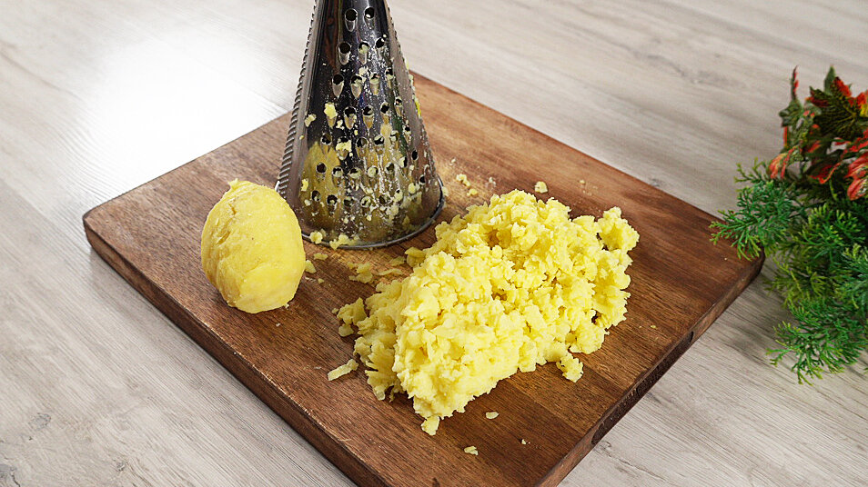 Способ приготовления: Натираем варенный картофель на крупной терке. Выкладываем форму для торта или любую круглую форму на тарелку. Смазываем тарелку майонезом и выкладываем поверх натертый картофель. Посыпаем солью и черным перцем и перемешиваем. Поверх картофеля поливаем майонезом. И выравниваем его по