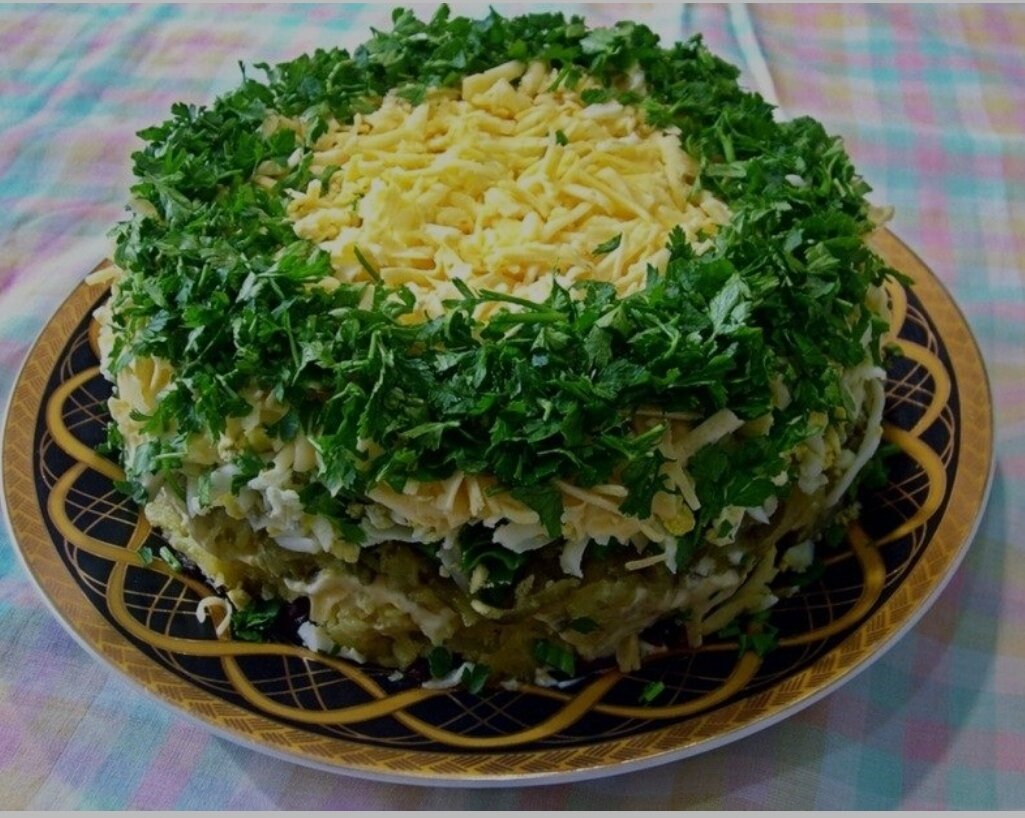 Закуска "Грибы под шубой" Красивая зеленая опушка, под слоями которой спрятались грибочки, не останется нетронутой на тарелке, а для ее приготовления надлежит подготовить: 500 г свежих шампиньонов; 200 г отварного картофеля; 4 сваренных вкрутую яиц; 200 г твердого сыра; 200 г маринованных огурцов; 140 г лука; 80 г зеленого лука (перо); майонез и растительное масло. Очередность действий: 1) Репчатый лук нашинковать кубиками, а грибы – тонкими слайсами. Затем все обжарить на сковороде до готовности и дать полностью остыть. 2) Отделить два желтка, а остальные вместе с белками, огурцами, картошкой и сыром измельчить на крупной терке. Зеленые перья не очень мелко порубить ножом. 3) Собирать закуску следует также слоями: грибы, картошка, зеленый лук (немного оставить для украшения), огурцы, яйца, сыр. Между ингредиентами обязательно следует делать майонезную сеточку. 4)В качестве декора в центр раскрошить желтки, а по краям обсыпать рублеными зелеными перьями.