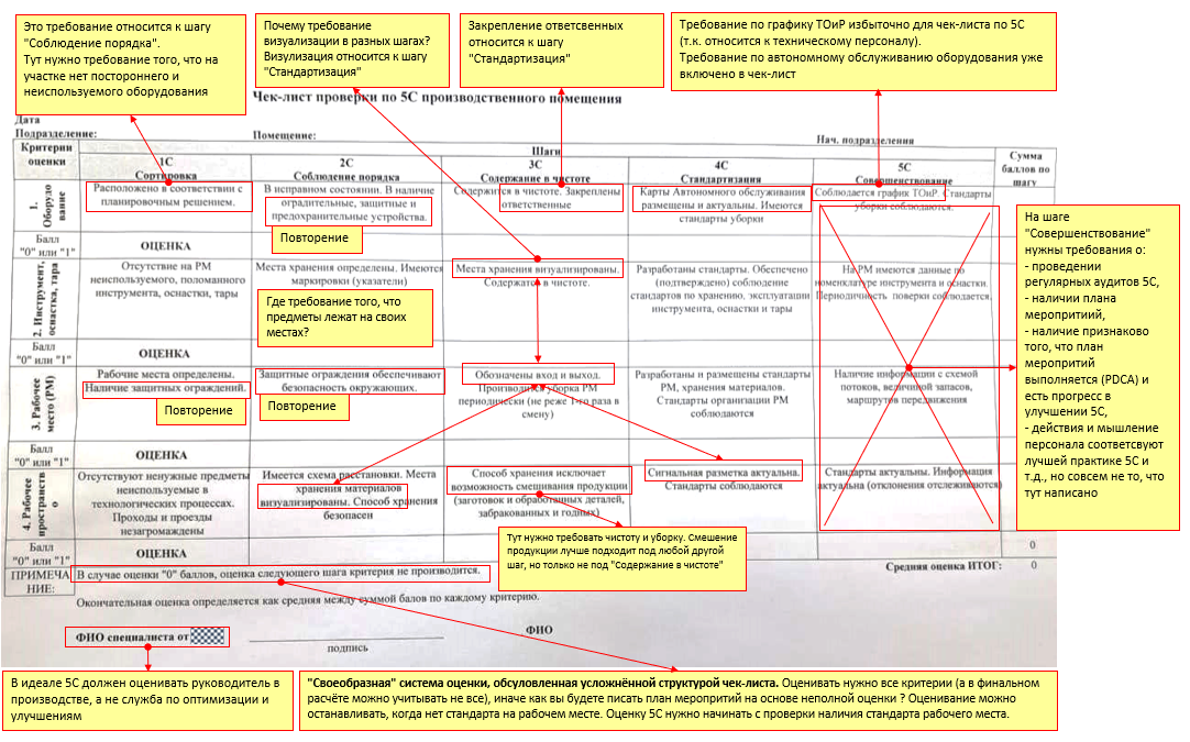 Как часто, приезжая на промышленное предприятие, вы не обнаруживаете там ни корпоративной процедуры по управлению 5S, ни чек-листа по оценке уровня 5S, ни плана мероприятий по "наведению" 5S ? Вот и я думал, что уже не осталось таких предприятий, которые не встроили бы 5S в ДНК своей производственной системы. Но я ошибался. Не буду вдаваться в подробности текущего статуса по 5S на этой площадке… он ниже ожиданий, но всё же… плохой статус - тоже статус. То там и тут попадаются остатки былой роскоши - неактуальные и желтые как пергамент визуальные инструкции, ложементы для оснастки, от которых остались только "тени", пыльные плакаты про 5S, свисающие с потока и т.д. Сегодня история о том, как оценить текущий статус 5S. И первое, что для этого нужно - это чек-лист. Когда начинаю работу с площадкой, я знакомлюсь с "местными" инструментами управления производственной системой. И вот какой чек-лист 5S мне дали специалисты по развитию производственной системы на этой площадке: Смог ли я с ним