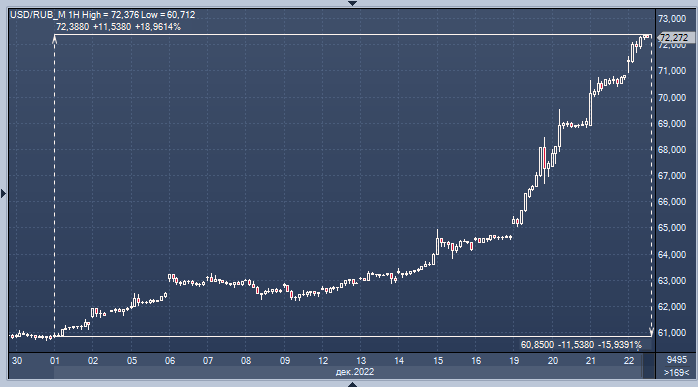 Рубль продолжает свое "безудержное падение", пишут аналитики Veles Capital. По их словам, пробой валюты выше психологически важных уровней 70 за доллар, 75 за евро и 10 за юаньможет открыть новые горизонты снижения для российской валюты. Падение экспортных доходов в последние месяцы усугубилось нефтяным эмбарго Европейского союза, которое началось в декабре, когда также вступило в силу ограничение цен на нефть.