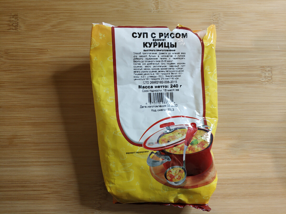 Приветствую, уважаемые! Вот одна из моих покупок в магазине Светофор - суп с рисом с ароматом курицы быстрого приготовления! стоит пачка 240 гр - всего 25 руб. Для такого объема это очень дешево... Да еще и с рисом! Я никогда не пробовала суп быстрого приготовления с рисом! Его же не заваришь, его варить все равно надо, так что словосочетание - быстрого приготовления - это весьма условно! Давайте подробнее сначала покажу этикетку и описание. Состав для начала: интересно то, что нужно залить водой кипящей 4 литра! Получается большой объем супа! Нетто в упаковке сухого - 240 г. Варится 25-35 мин. Я сначала, когда открыла, по виду засомневалась, что из этого получится суп! Просто вид был - как будто только рис. Цвет риса и специи практически не видны. Запаха тоже почти не было особо... Но вот сварила я, но варила, кажется минут 20, не больше. Побоялась, что переварится рис, так попробовала, рис сварился и сняла с плиты. Вид вот такой, кто-то сейчас скажет, что не аппетитный... Но