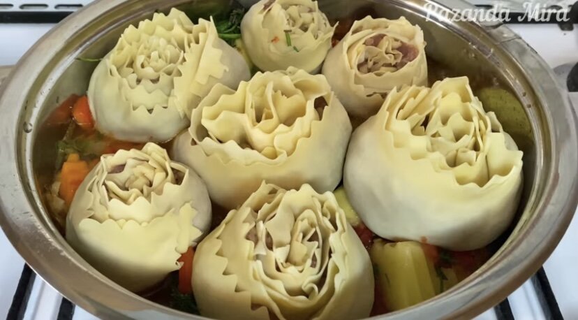 Вкуснейшее блюдо узбекской кухни готовится легко и быстро и из самых доступных ингредиентов.Для теста нам нужно Ингредиенты мука-200гр 💧 вода-65гр 🥚 яйцо-1шт соль-1ч/л начинка: 🥔 картофель -1шт 🧅 лук репчатый -2 средние фарш говяжий -350 гр масло растительное-40мл соль ,перец, кориандр по вкусу для зажарки : растит масло 35-мл репчатый лук- 1 шт морковь-1 шт томатная паста 1 ст л болгариский перец 1 шт Помидор 1 шт картофель 1 шт Вода 200 мл В глубокой миске замешиваем все ингредиенты для теста оно должно получится упругим и гладким и оставляем в пакете на 20 минут отдохнуть В отдельной миске смешиваем ингредиенты для начинки предварительно мелко нарезав,заправляем маслом и специями и хорошенько перемешиваем. берём тесто ещё раз обминаем руками и раскатываем в тонкий пласт и изрезаем на прямоугольные формы и разрезаем на одинаковы полоски на каждую полоску выкладываем начинку и сворачиваем в рулетик. Тем временем в разогретую сковороду готовим зажарку ( растительное масло, л