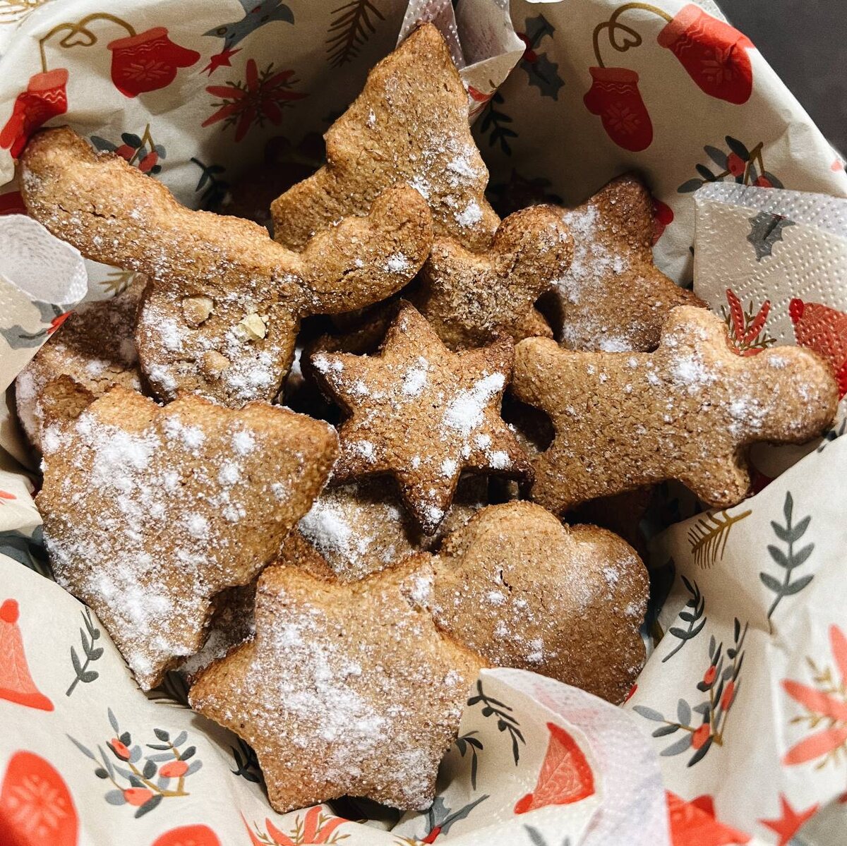 Ингредиенты: 1 шт яйцо кипяток 3 ст. л сливочное масло 100 гр. имбирь молотый 1 ч л мускатный орех 1 ч л корица 1 ч л ванилин 1 ч л разрыхлитель 1 ч л соль щепотка мёд 6-7 ст л мука ц/з 1,5 стакана +- сахарная пудра для украшения Приготовление: Растопите масло. Добавьте в него мед. Так же взбитое яйцо. Смешаете все сухие ингредиенты: муку и т д. Масляную смесь смешайте с сухой . Влейте кипяток. Вымешайте тесто до однородности. Выложите тесто в пищевую пленку и поставьте в холодное место на 2 часа. Застелите в противень бумагой для запекания и смажьте маслом. Далее нужно раскатать готовое тесто и используя маленькие формы для печенья. Выложить заготовки на противень и запекать 15-20 минут при 180 градусах. Готовые печеньки посыпьте сахарной пудрой! А можно ещё глазурь по желанию приготовить