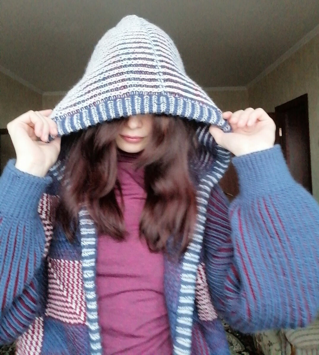 Затем я набрала по вороту петли и начала вязать капюшон. Тоже английской резинкой. Провязала 30 см (для женского капюшона можно чуть меньше — 25 см), затем ещё 10 см с убавлениями: в каждом лицевом ряду провязывала 3 вместе лицевой по центру капюшона. Чтобы убавление пришлось ровно на центр английской резинки, на капюшон нужно набирать нечётное количество петель, а чередование лицевых и изнаночных просчитать так, чтобы центральная петля была лицевой.