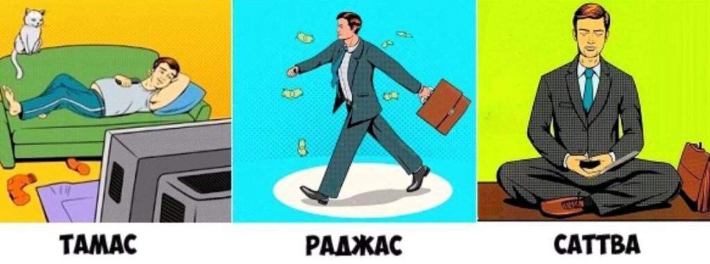 - Какие эмоции у нас преобладают: если страх – то это тамас, если гнев – то это раджас, если счастливое состояние – это саттва.
