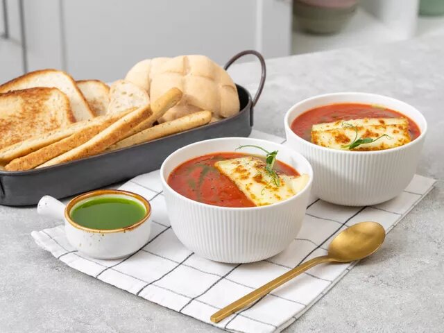 Вкусный и легкий томатный суп с халуми легко составит конкуренцию гаспачо и другим супам, которые легко готовятся. Не переборщите с солью, так как сыр сам по себе достаточно соленый, а попробовать блюдо на вкус можно будет уже в готовом виде. Пряность и кислинку добавляют также томаты, а остроту супу отдаст чеснок. ПРОДУКТЫ ДЛЯ РЕЦЕПТА Для блюда Помидоры в собственном соку 200 г Красный болгарский перец 4 шт. = 600 г Сыр халуми 100 г Оливковое масло 100 г Чеснок 2 зубчик = 6 г Петрушка 20 г Соль по вкусу Черный перец молотый по вкусу ПОШАГОВЫЙ ФОТОРЕЦЕПТ ШАГ 1 Очистите печеный перец от кожуры. Нарежьте сыр слайсами толщиной до 1 см. ШАГ 2 Приготовьте зеленое масло. Соедините 100 мл оливкового масла, петрушку и один зубчик чеснока и взбейте блендером. Добавьте соль и перец по вкусу. ШАГ 3 Пробейте в блендере перец и томаты в собственном соку, посолите по вкусу. Разогрейте сковороду и обжарьте кусочки сыра до золотистой корочки с каждой стороны. ШАГ 4 Разлейте суп по тарелкам, вы