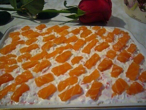 #рецепт Салат "Уральские самоцветы" Ингредиенты: -100 г малосольной красной рыбы, -4 картофелины, -3 яйца, -150 г твердого сыра, -1 пачка крабовых палочек. Приготовление: Всё отдельно натереть на крупной тёрке, чередовать слоями: 1. картофель, 2. яйца, 3. сыр, 4. крабовые палочки. Каждый слой промазывать майонезом. Сверху украсить нарезанной соломкой красной рыбой. Очень вкусный и нежный салат. Думаю он займёт почётное место в вашей семье! Приятного аппетита!!!!!