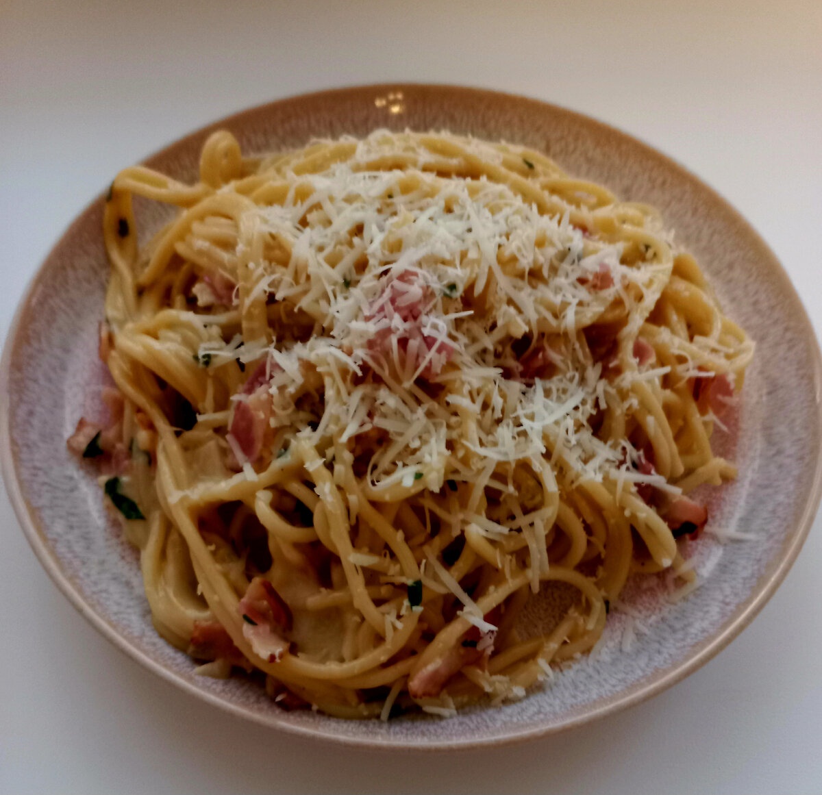 Ингредиенты: Приготовление: Бекон нарезаем тонкими полосками и обжариваем на среднем огне минут 5 Добавить мелко порезанный чеснок, перемешать и ещё немного обжарить Через пару минут добавить зелень петрушки Перемешать и выключить газ. Взбиваем венчиком до однородности для соуса желтки Вливаем сливки и снова немного взбиваем Понемногу добавляем 150 гр натертого на мелкой тёрке сыра и перемешиваем * остальной сыр оставим, чтобы посыпать пасту при подаче Посолить немного и поперчить Спагетти отварить * обычно это 8-10 минуты Откинуть на дуршлаг Горячие выкладываем в сковороду с беконом, добавляем соус и перемешиваем Вуаля! Карбонара готова! При подаче немного посыпаем сыром. Приятного аппетита и моё Вам почтение)