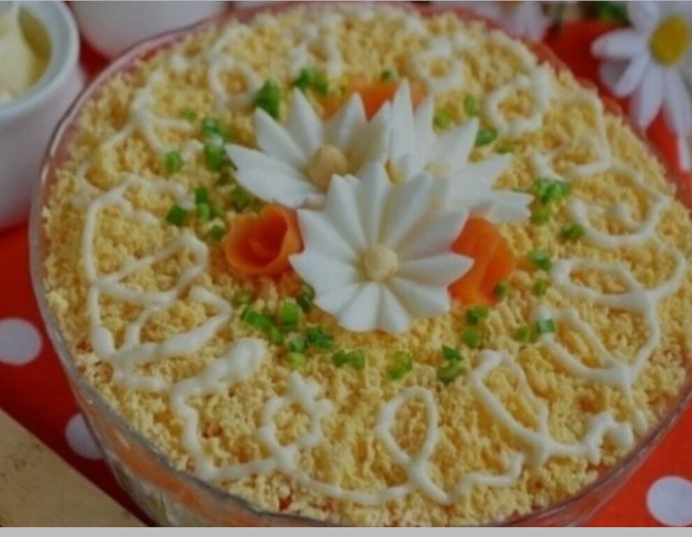Салат "Нежность" На первый взгляд он ничем не примечателен, но уверяю вас, его стоит обязательно приготовить. Ингредиенты: Куриная печень — 350 г Огурцы маринованные — 2–4 шт. Яйцо крупное — 4 шт. Морковь — 4 шт. Лук — 4 шт. (или 2 крупных) Майонез — 100 г Соль — по вкусу Масло рафинированное — для жарки лука Зелень — для украшения салата Приготовление: 1. Отварите до готовности морковь, яйца и печень . Остудите. 2. Очистите лук, порежьте его небольшими кубиками. Обжарьте на растительном масле до готовности. Добавьте щепотку соли. 3. Разделите белки и желтки. Белки натрите на крупной терке. Желтки отложите для самого последнего слоя. Из части белка можно сделать цветочки для украшения салата. 4. Огурчики порежьте кубиками небольшого размера. Если огурцы не крупные, то возьмите четыре штуки, крупных достаточно двух. 5. Морковь очистите о кожуры, натрите на крупной терке. Кусочек моркови я отложила для украшения салата. 6. Печень порежьте соломкой или кубиками, как получится. 7. Приступ