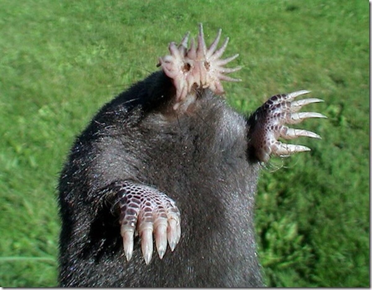 Крот звездонос Одно из самых необычных животных на планете. Внешне он похож на обычного крота, но его нос настолько необычен, что сразу обращает на себя внимание. На кончике рыльца у звездоноса находится по одиннадцать наростов с каждой стороны. Они являются органом осязания и постоянно находятся в движении. Двигаются они очень быстро, по проведенным исследованиям выяснилось, что звездонос может проверить до 13 объектов в секунду своим чудо-носом. Его нос считается самым чувствительным органом осязания на планете. Интересно, что чувствительные выросты у звездоноса работают в том же режиме, в котором работают и глаза у различных млекопитающих, когда выполняют саккады (саккадами называются согласованные движения глаз, которые происходят в одном направлении одновременно). Благодаря постоянному движению выростов крот может оценивать структуру поверхности любого объекта примерно так же, как человек осматривал бы ее глазами. Так, зверек с молниеносной скоростью может разобраться, находится п