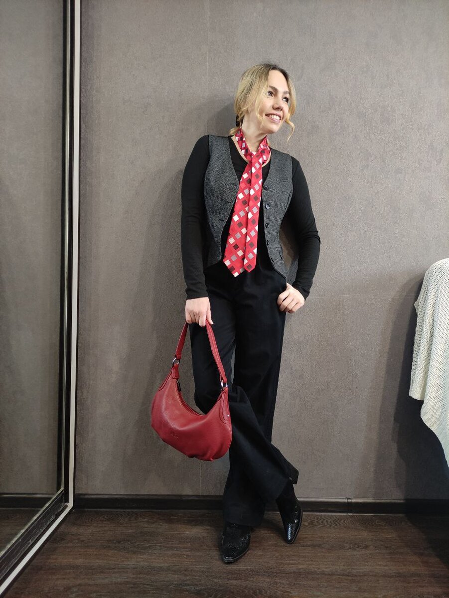 Сегодня монохром с красными акцентами – галстуком и сумкой.