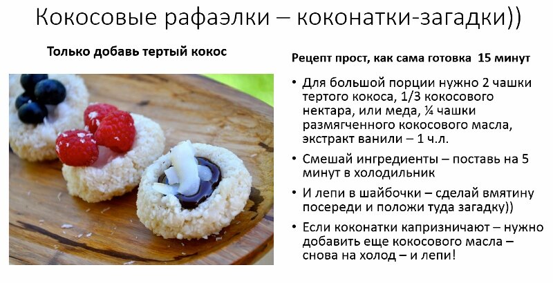 Всем привет! Нашла рецепты 2016 года. Новое меню к Новому году на подходе. А пока приглашаю вас в готовку со вкусом и интересом. Начну с десертов)) Кокосовый рафаэлки - Коконатки загадки Рафаэлки — готовятся за 15 минут, состав: тертый кокос, мед, или сироп топинамбура/цикория, кокосовое масло, экстракт ванили, для топпинга шоколад, свежие фрукты и ягоды, орехи Мой любимый коко-шоко-баобаб Коко-шоко баобаб с сюрпризом. Для готовки нужны кокосовое масло, молоко, сахар, мука, ваниль, корица, мускатный орех, порошок баобаба, какао, чиа. Этот рецепт - аналог прошловековых трюфелей на "Малыше", помните? Я делала из сливочного масла, сахара или сгущенки какао. В рецепте шоколадных вкусняшек на сегодня должны быть: какао масло, какао паста, манк суперфрукт/лаканто, или сиропы цикория/топинамбура. Сухой фазой могут быть кокосовая, миндальная мука, какао порошок. Остальные ингредиенты - по вкусу и наличию. У меня дома ооочень много ингредиентов, я стала активно готовить с 2015 года. Caulliflow