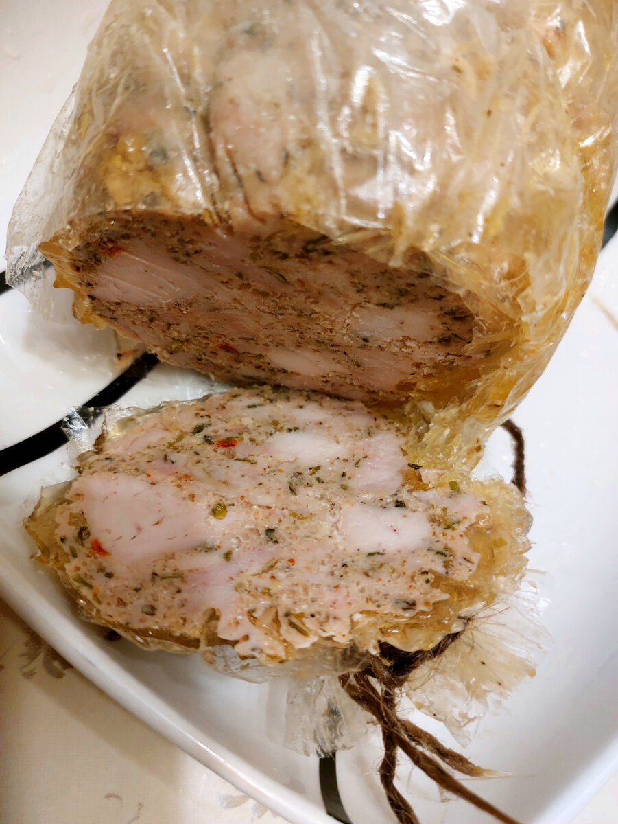 Мы с вами уже готовили (варили, запекали) вкуснейшую ветчину из свинины и из курицы - ссылки повторю внизу. А сегодня будем готовить ветчину из курицы на пару - берем и красное (бедра), и белое (грудки) мясо. Нам потребуется: - куриное филе - 300 г - мясо куриных окорочков - 450 г - желатин - 20 г - куркума - 2 щепоти - смесь перцев - по вкусу - чеснок сушенный - 1 ст.л. - мускатный орех - 1/4 ч. л - паприка - 1 ст.л. - петрушка сухая - 2 ст.л. - итальянские травы - 5 г - если любите, можно добавить горчицу - специи для курицы или любые любмые вами специи к мясу - 5 г (я добавляю смесь из кориандра, тимьяна, орегано, бизилика, сухой аджики) - соль - 11-12 г, при этом половина, желательно, нитритной - холодный бульон или вода ~ 50 Готовим: Мясо бедер прокручиваем на мясорубку, мясо грудки режем кусочками 1 см на 2 см Подготовленное мясо перемешиваем, всыпаем желатин, добавляем холодную воду (или бульон) и пряности. Тщательно перемешиваем до уплотнения фарша и образования тонких б