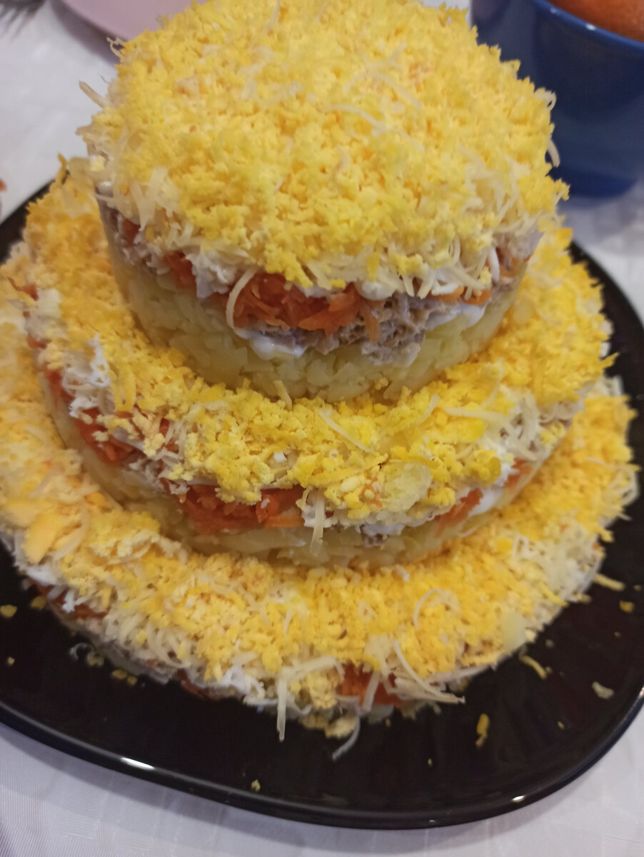 Праздничное оформление салата "Мимоза" Мимоза,это салат с тех пор ,нашей еще молодости.Каждая хозяйка делает его по своему,а сейчас в интернете так совсем много вариаций.Я пробовала и с добавлением свежего яблока, и со сливочным маслом.Но подача разная и украшение сверху можно разное.В какой то Новый год сделали в форме торта.Все три ступени одинаковы по составу,выкладывается сначала форма самая большая и так,меняя формы,достигаем эффект торта.На фото видны слои,попробую перечислить продукты: картофель,горбуша консервированная.немного лука,морковь,белки от яиц,сыр,сверху желток яичный.Ну понятно,что овощи заранее сварены,потерты на терке слоями и между слоями промазано майонезом,а лучше выдавливать тонкой струйкой. Этот салат не надоедает!