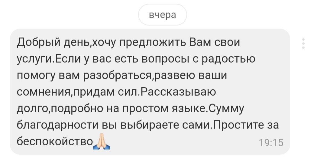 Предложила мне женщина свои услуги. Разобраться с вопросами, развеять сомнения и придать сил. Потратить на меня много времени и самой оценить её работу. И ещё простить за беспокойство😇. Не много ли хочет от меня, незнакомый мне, явно "голодный" человек🧐? Именно от меня, ведь если у человека есть собственная энергия, он не будет искать людей, как написано в последнем её сообщении. Предлагая всем подряд свои услуги. В надежде, что хоть кто-то откликнется. А люди будут приходить к нему сами. Тем более, в наш век цифровых технологий, когда есть множество площадок на которых можно проявлять себя и показывать другим, чем ты можешь быть им полезен и что из себя представляешь. Но дело здесь конечно не в площадках, а в том, что когда человек не ценит и не уважает себя и свой труд, то никто к нему и не идёт.