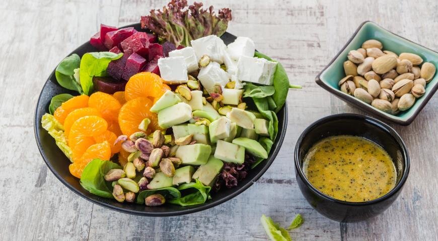 Салат из свеклы, мандаринов и авокадо с маковой заправкой