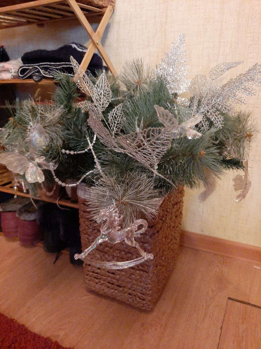 Вот эта композиция в корзине мне нравится больше всего. Стоит она рядом с обувницей. Я добавила серебряных веточек ( у меня были ранее купленные ветки из фикса и я еще докупила в этом году). На веточки повесила акриловые игрушки все из того же фикса. Часть игрушек старых. Но и в этом году я покупала оленей, лошадку и снежинки. Повесила акриловые бусы и гирлянду в виде сосулек. И как мне кажется, получилась довольно стильная композиция в современном ключе. Акриловые прозрачные игрушки на елках в этом году - тренд. Снежинки потом переехали в другую комнату. Но и без них все выглядит вполне достойно