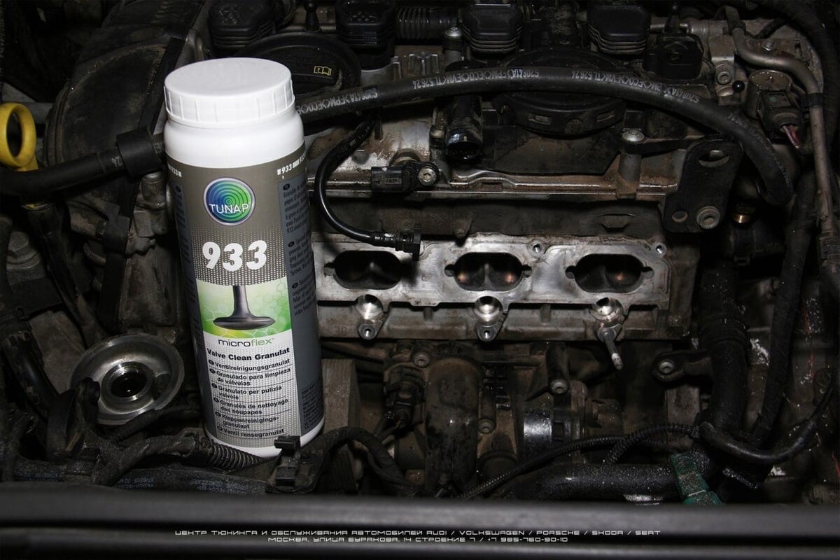 По результатам проведенной диагностики были выявлены твёрдые отложения во впускном тракте, на тарелках и шейках клапанов [ На фотографии ][ Мы часто говорим про это - моторы линейки TSI / FSI и TFSI склонны к образования отложений, форсунки устанавливаются в местах, где температура экстремально высокая, при непосредственном впрыске топлива достигается сухое горение с очень высокой температурой ]