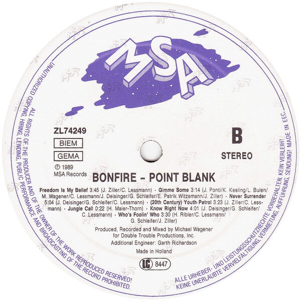Point Blank третий альбом рок-группы Bonfire был выпущен в 1989 году на лейбле BMG International. Он вошел в чарты альбомов Британии 21 октября 1989 года и достиг 74-й позиции. Альбом стал продолжением прорывного Fireworks и превзошел все ожидания. альбом с разбивкой на треки на Youtube и mail Лучшим сравнением будет Jump the Gun эпохи Pretty Maids. Музыка начинается с Bang Down the Door и Waste No Time, двух полубыстрых песен, наполненных хард-роком, с заразительными мелодиями и взрывом энергии. Hard On Me имеет несколько хороших клавишных во вступлении и немного замедляется до более среднего темпа. После этого следует первая баллада.. В Tony's Roulette есть гитарная мелодия, которая очень узнаваема, и кричащий припев делает эту песню хитом среди поклонников Bonfire.. Во время записи альбома Ханс Циллер был уволен из группы, но в альбом вошли 10 песен, написанных им, а также 3 песни, в которых он играет... Рекомендуемые к прослушиванию песни: Hard On Me, Bang Down The Door
