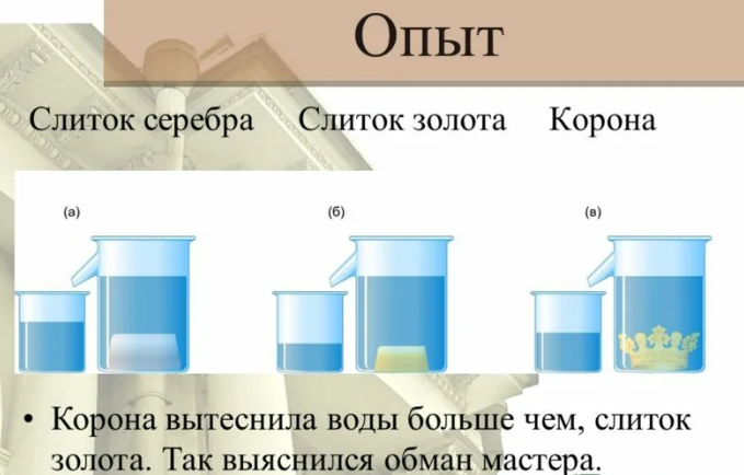 Рассказываю легенду об Архимеде и царе Гиероне. Однажды царь Сиракуз Гиерон II засомневался- из чистого ли золота сделана его корона.
