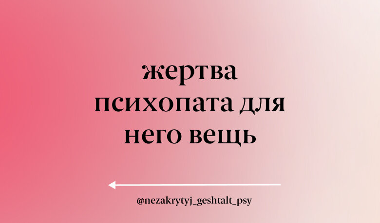 Отношение психопата к своей жертве - как к вещи. У вещи нет своей воли, своих желаний. В таких отношениях вещь ничего не решает, психопат знает лучше как его вещи лучше. Яркий маркер - вещь не может уйти от психопата и вступить в новые отношения, психопат может только либо сам "отдать вещь", либо в своем больном мире "затребовать вещь назад". Особенно странно это выглядит, когда психопат возвращается к своей жертве и напрочь игнорирует ее волю быть в новых отношениях, есть только его "хочу все вернуть" и странное право собственности. Психопат может умотаться на все четыре стороны строить другие отношения, к своему настоящему счастью, "решать свои проблемы", "делать дела" (и весь этот контекст - всегда априори важнее проблем и дел жертвы), а потом заявиться на пороге как ни в чем не бывало, чтобы потом обвинять жертву в предательстве, если она вместо страданий и режима "вещь на станции подзарядки" выбрала жить дальше, восстанавливаться и вступать в новые отношения. Тут счет идет на мес