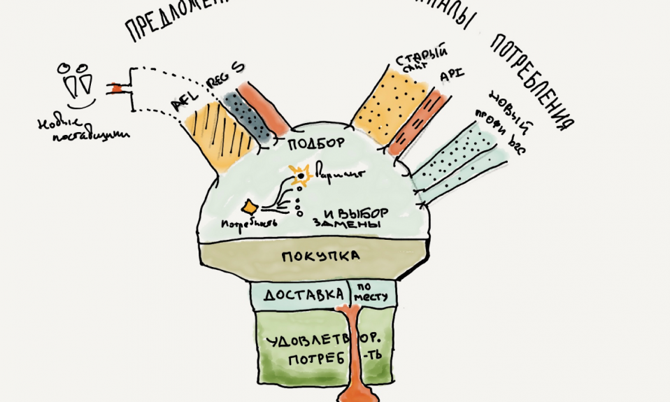К примеру, ниже показана принципиальная схема для маркетплейса запчастей. В «котёл» подбора вариантов и принятия решения попадают потоки потребителей и поток предложений от поставщиков и продавцов. На каждый из каналов, приводящий часть потока, можно воздействовать. Наша задача на этом этапе — вычленить каналы и перенести их на дерево в виде словесных формулировок.