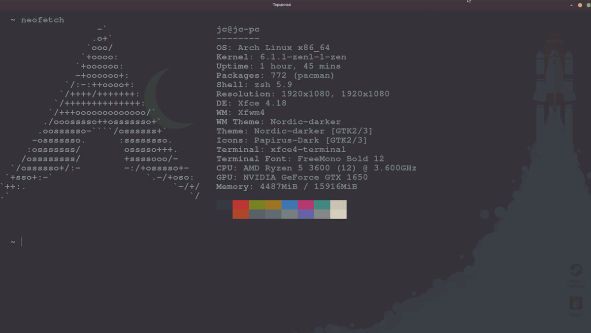 У меня стоит оболочка ZSH, потому мне достаточно изменить файл .zshrc, который находится в домашней директории пользователя. После при запуске терминала в нем будет выполняться команда nerdfetch и будет выводиться соответствующий «выхлоп».