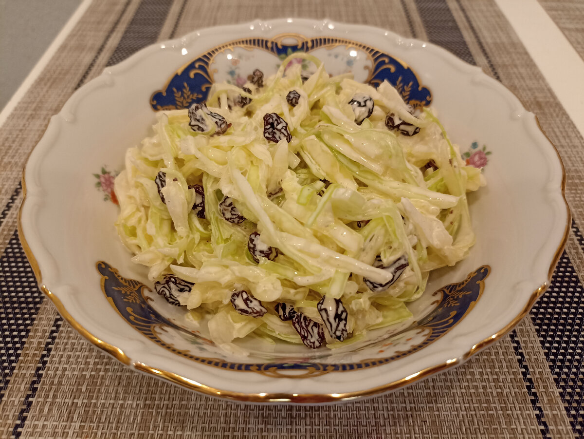 Майонез и соль - по вкусу 1. Капусту шинкуем. 2. Перекладываем в походящую емкость, добавляем половину чайной ложки сахара, сок четвертинки лимона и соль по вкусу. С солью главное не переборщить - если что досолим позже. 3. Тщательно разминаем руками капусту с солью, сахаром и лимонным соком и оставляем минут на 10. 4. Тем временем замачиваем наш изюм в кипятке и даем ему также настояться 10 минут, чтобы он стал мягким. 5. Добавляем к капусте изюм и майонез. Тщательно перемешиваем и пробуем, если требуется - добавляем соли, чтобы довести до вкуса. 6. Наша салат готов! Приятного аппетита!