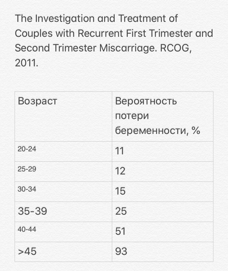 Да, репродуктологи способны на чудо, но просто забеременеть мало. Надо выносить⠀ Среди всех подтверждённых беременностей, в ранних сроках уходит в «потери» 12-15% (Little AB, 1988). На самом деле считать можно по-разному, поэтому в литературе можно встретить 16-17% и даже 20%.⠀ Но картина может оказаться еще более мрачной. Если считать биохимические беременности, то ещё, как минимум, 15% оплодотворённых яйцеклеток теряются до имплантации: кто-то не дошёл до матки, кто-то не смог прикрепиться.⠀ Если пытаться учитывать и подтверждённые и не подтверждённые беременности, число потерь разгоняется до 52% (Stirrat GM, 1992).⠀ Так мы далеко уйдём, товарищи. С такой арифметикой у нас здоровых женщин не останется. Именно поэтому я против учёта биохимических беременностей вне циклов ВРТ. Хотя производители Дюфастона очень даже «за» и бегают с этой идеей по всей России.⠀ Англичане заморочились и посчитали риски по возрастам (RCOG, 2011). Это чудовищная история для тех, кто до сих пор не хочет ниче