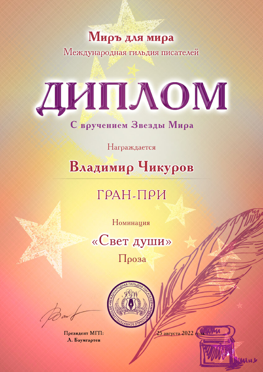 Не смотря на сегодняшнюю Европейскую русофобию, подумал, а пошлю ка я им туда статью о наступлении Эпохи РОДославия, да стихи про расцвет Русского Духа. Пускай просвещается старуха Европа. И послал. В итоге, недавно присылают мне известие о том, что присвоили Гран-при. Вот это да! Ладно бы за простое художественное произведение. Так нет, именно за новое РОДославное мировоззрение, и за стихи о Русском Духе.