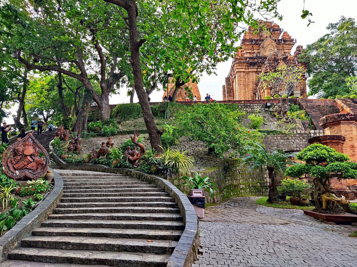 Ещё одна достопримечательность северного Нячанга — это Чамские башни, или башни По Нагар. Находятся они на вершине горы Ку-Лао, откуда открывается вид на весь город. Духовное место силы, где проводятся буддийские ритуалы. Башни — часть храма, построенного в VII-XII веке. Четыре башни из 10 сохранились до наших дней. Сам храм, к сожалению, не сохранился. Ну что же…вверх, так вверх! Гора в реальности оказалась не такой большой. Не очень высокая лестница, наверху 4 башни из красного кирпича. Самая большая посвящена матери-королеве По Нагар, внутри расположена её статуя. Три поменьше посвящены богам Кри Камбху, Сандхаке и Ганеше. В каждой из них располагается алтарь с буддийскими божествами и зажженными благовониями. Внутрь можно зайти, сняв обувь перед входом. Башни отличаются друг от друга, так как они строились в разные времена. Когда-то давно тут совершали ритуалы и жертвоприношения древним богам. И по сей день ежегодно в марте у Чамских башен проходит религиозный фестиваль Тхап Ба. С