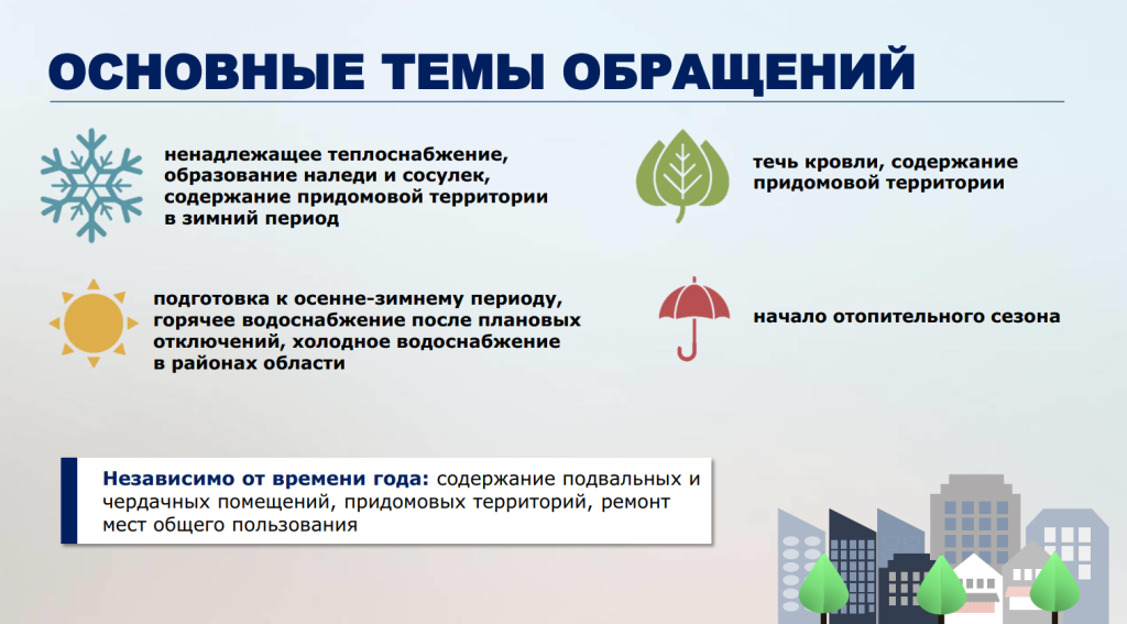 Темы обращений зависели от сезона. Зима – это вопросы теплоснабжения, а также наледь, сосульки и уборка придомовых территорий. Весной актуальна тема благоустройства, летом – подготовка к осенне-зимнему периоду.