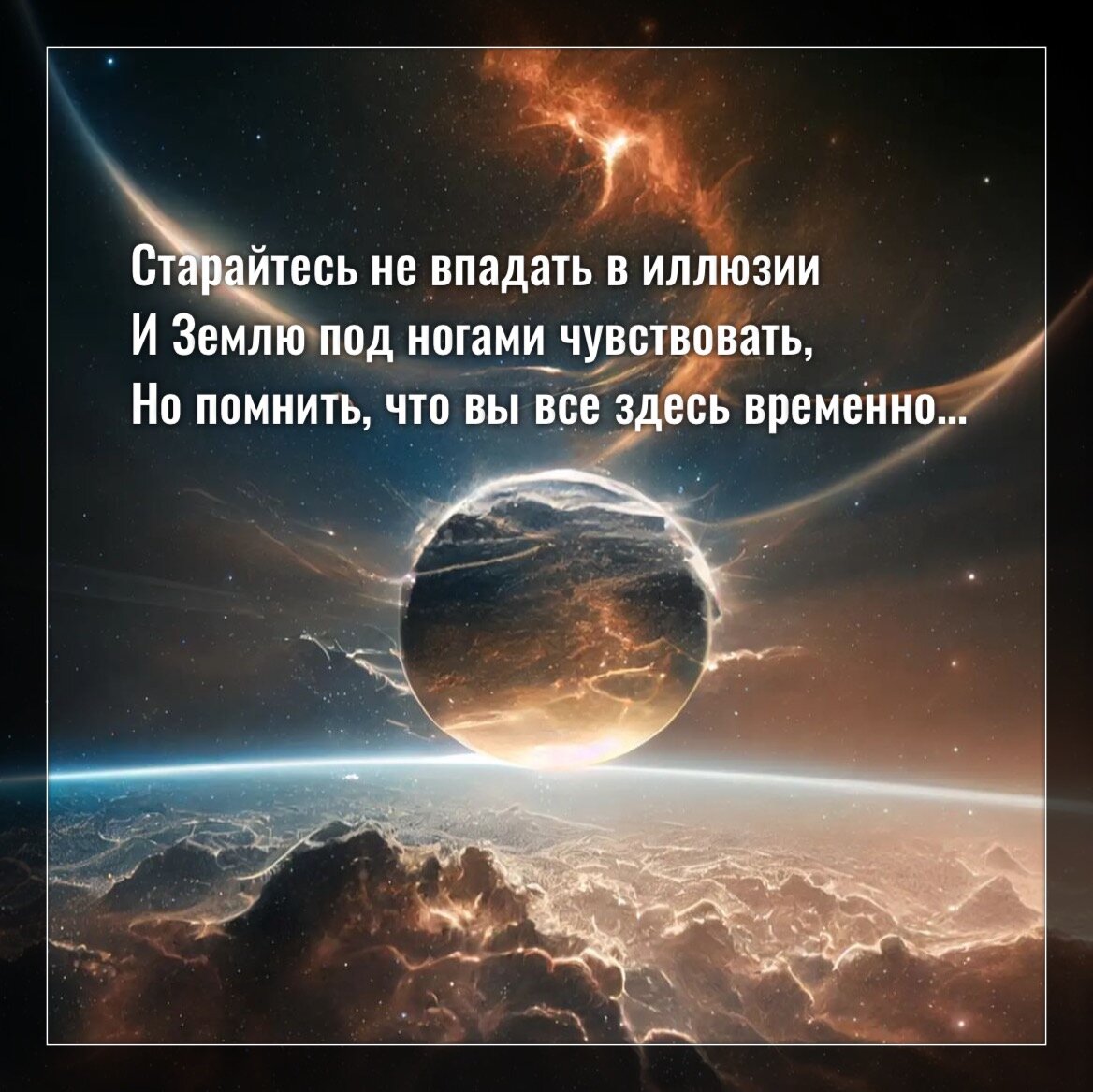Старайтесь не впадать в иллюзии И Землю под ногами чувствовать, Но помнить, что вы все здесь временно, Кто в тонкий мир не верит, тем можно посочувствовать. Откройте Души и сердца для изменений, Сейчас придут энергии другие, Когда для тьмы ни места, ни пространства не останется, Уйдут тихонько времена плохие. Старайтесь больше светлых дел творить И мысли негативные стирать, Вам небо может всё простить, Если не будете духовно умирать, А станете расти и развиваться, Задумываясь о Душе своей, И действия осознанно все делать, Не пробуя помочь Планете всей, Себя поставить для начала на ноги, И выполнять своё предназначение, Тогда не будет больше к миссии «Спасти людей вокруг» влечения.