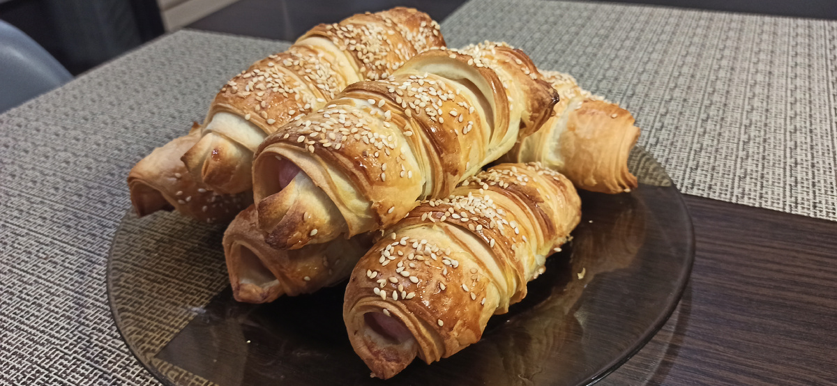 Сосиски в тесте это уже классика. Оту закуску можно употреблять в любом месте и с любым напитком. Но куда лучше приготовить самому и скушать свежими, чем рисковать с "вокзальными" образцами. Для приготовления домашних сосисок в тесте понадобится 6-7 стандартных любимых сосисок, упаковка слоёного дрожжевого теста, яйцо и кунжут. По инструкции размораживаем слоёное тесто, очищаем сосиски. Затем отрезаем полоску теста, слегка раскатываем и заворачиваем сосиску в неё. Уложив все на противень с пергаментом, взбиваем яйцо и смазываем верхушки заготовок и посылаем кунжутом. В разогретую до 190°С (в зависимости от Вашей духовки) ставим сосиски на минуток 15-17. Приятного аппетита !