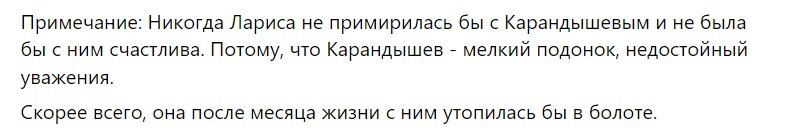 Иногда получаю любопытные комментарии. К сожалению, ответить каждому читателю невозможно физически - просто нет времени. Мне приходит примерно по 300 коментов в день на канале про кино и еще 100 - про путешествия. Поэтому читать всё я просто не могу. Надеюсь, вы меня понимаете. Если подобных комментариев становится много, проще написать статью. Скорее всего, моя читательница просто перепутала с "Грозой". Вот там да, Катерина утопилась. "Бесприданница" это другое произведение. Конечно же, Лариса была красивой девушкой и хорошо пела. "Божественно", как сказал Робинзон. Но в общем-то она также была и небольшого ума. Иными словами, не блистала интеллектом. Круг общения ограниченный. Мать сомнительная женщина, да и вообще не с кем обсудить Канта, Гегеля или хотя бы Достоевского. Когда Кнуров говорил, что Карандышев Ларисе не пара, имелась в виду, конечно же, внешность и обхождение. Плюс сам Карандышев выглядел бесцветной молью, особенно на фоне богача Мокия и его дружков. Не следует забыват