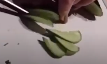 Разрезаем огурец наискось, а затем вдоль, нарезаем на тонкие слайсы.
