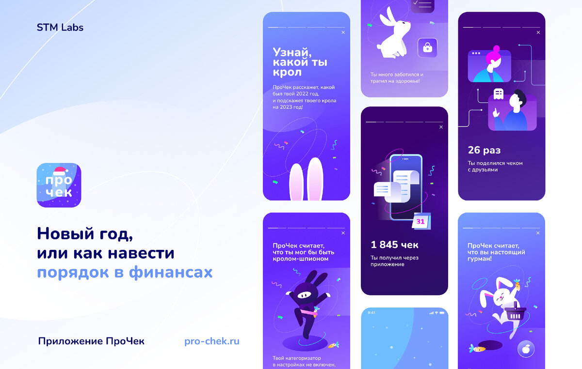 ПроЧек подготовил для пользователей статистику за год и раздает награды в номинации «Какой ты крол» в ожидании года Кролика. О новогодних функциях расскажет наш UX-дизайнер Екатерина — это она придумала добавить итоги года в ПроЧек. Привет, я Катя, UХ-дизайнер в STM Labs. Я работаю над интерфейсом ПроЧека и сама пользуюсь приложением. И да, могу немного влиять на его развитие. Кто-то когда-то придумал подводить итоги в конце года, и это стало почти традицией. Теперь каждый сервис присылает статистику: что ты смотрел, какую музыку слушал, сколько заказов сделал и куда летал чаще всего. Для ПроЧека это первый Новый год, но наше приложение точно не могло остаться в стороне от всеобщих веяний. Поэтому я предложила команде сделать и у нас раздел с подведением итогов. Идею подхватили, ведь это классный способ поздравить пользователей с Новым Годом и поблагодарить за пользование нашим сервисом. Разработчики сказали, что реализовать такой раздел не очень сложно, ведь все данные в приложении уж