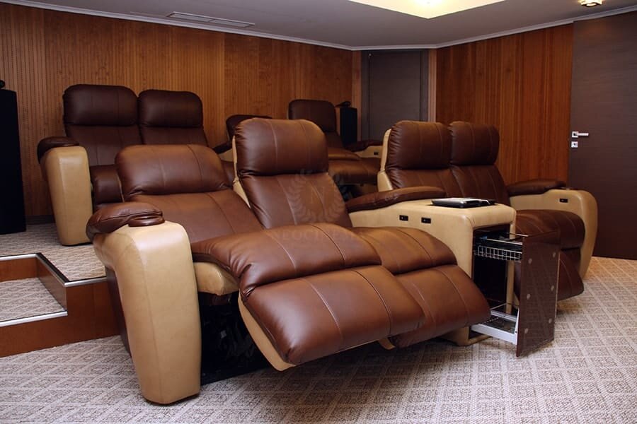 По запросу клиента в отдельном помещении площадью 35 кв. метров с уже готовой чистовой отделкой должен был расположиться кинозал на 8 посадочных мест. Кресла-реклайнеры серии Massive изготовлены на заказ по индивидуальному проекту. Кресла дополнительно оснащены подстаканниками и мини-баром. 1. ПРОЦЕСС РЕАЛИЗАЦИИ ПРОЕКТА Этапы строительства кинозала «Барвиха» На работу по созданию персонального кинозала отводился один месяц. После проведения акустических замеров старая шумоизоляция была полностью заменена на новые шумоизоляционные материалы. Также в помещении для кинозала был осуществлен монтаж акустических панелей. Прежнее напольное покрытие заменили новой паркетной доской. На пол и возведенный подиум для кресел был постелен ковролин. Кресла-реклайнеры изготовлены на заказ по индивидуальному проекту. Кресла дополнительно оснащены подстаканниками и мини-баром. Заказчик выбрал самую функциональную серию кресел – Massive. Мебель обтянута натуральной кожей премиум-класса (производство Ита