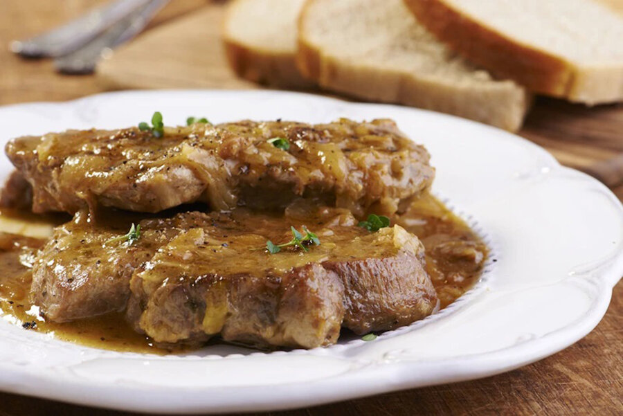 На праздники я очень люблю делать эти отличные отбивные из свинины к Новому году. Попробуйте этот рецепт, это вкусное блюдо непременно понравится вашим гостям. Ингредиенты: Приготовление: Мясо промыть и нарезать ломтиками толщиной 2 см. Слегка отбейте каждый кусочек молотком, посыпьте перцем и мукой. Затем обжарьте их с обеих сторон до золотистого цвета в горячем масле. Лук нарезать и обжарить в кастрюле в горячем масле, добавить майоран, лавровый лист и зелень. Когда лук приобретет золотистый цвет, насыпьте оставшуюся муку и обжарьте вместе. Затем добавьте 1 л кипятка. Положите мясо, соус в жаркое с луком и тушите на медленном огне, пока шейка не станет мягкой. Подавать с картофелем или кашей. Приятного аппетита!