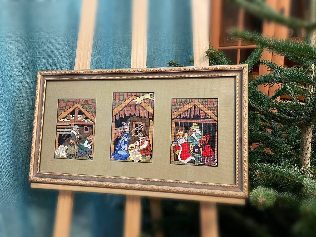 Всем привет. Каждый, кто серьезно увлечен вышивкой, хотя бы раз столкнулся с крайним неудовлетворением результатами своей работы. Причины могут быть разными: при вышивке самоподбором может разочаровать сам подбор ниток, цвет канвы может не подойти к сюжету и т.д. А бывает, что понимание того, что разработка ужасная, приходит очень поздно. Года полтора назад я решила, что к Новому году и Рождеству обязательно необходима тематическая вышивка и в это же время мне в руки попадает схема сцены "Поклонение Младенцу Иисусу" в виде триптиха. Не подумав хорошо над этой схемой, я решила ее вышить. Нитки были почти все в наличии, канва тоже. Начинала я с левой части, затем была средняя и в завершении правая. Уже вышив кусочек "потолка", я поняла, что схема и соответственно ключ к схеме - не символьный, а исключительно цветной. Все коричневые цвета на схеме и в ключе - одинаковые, поэтому каждый шаг сверялся с фотографией отшива, что почти никогда не помогало. Через муки и страдания я завершила в