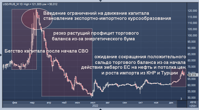 Российский рубль быстро падает по мере того, как сырьевой бум заканчивается Курс доллар/рубля на Мосбирже интервалами в 1 минуту Курс доллар/рубля на Forex интервалами в 4 часа Российский рубль в этом месяце является одной из валют с наихудшими показателями в мире, поскольку непредвиденная прибыль от нефти и газа, которая помогла оградить страну от западных санкций в этом году, сходит на нет. Рубль упал на 9,4% на прошлой неделе и на 14% в этом месяце по отношению к доллару США (на момент публикации - прим. ProFinance.ru; котировка USD/RUB на 13:53 мск понедельника -2,34% 68,52). Декабрьское снижение валюты является крупнейшим среди 49 валют, отслеживаемых The Wall Street Journal. В минувшую в среду за 1 доллар можно было купить около 71,6 рубля, максимум с апреля. Аналитики говорят, что снижение положительного сальдо торгового баланса России является причиной ослабления рубля. Один из ключевых факторов: попытка Запада ограничить доходы России от продажи нефти; норма вступила в силу в