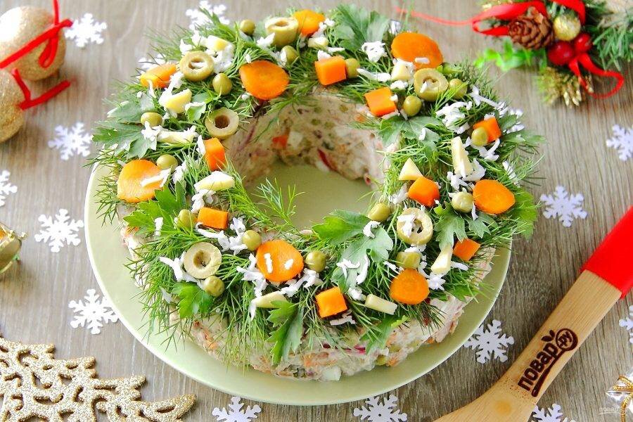 ИНГРЕДИЕНТЫ Приготовление 2. Лук тонко нарежьте четвертинками и замаринуйте в винном уксусе, после чего уксус слейте. Для заправки соедините натуральный или греческий йогурт, майонез, горчицу и соль по вкусу. С тунца слейте жидкость и разомните слегка вилкой. 3. В глубокую миску нарежьте картофель кубиками. 4. Добавьте нарезанную кубиками морковь. 5. Нарезанные примерно такими же кубиками огурцы. 6. И нарезанные кубиками яйца. 7. Положите горошек, слив с него предварительно жидкость. 8. Добавьте соус, лук и тунец. 9. Все хорошо перемешайте и переложите салат на сервировочное блюдо, разместив кулинарное кольцо. У меня кольцо от разъемной формы для выпечки, диаметром 18 см. В центр поставьте стакан. Примните салат сверху лопаткой. 10. Затем аккуратно извлеките стакан и уберите кольцо. 11. Украсьте салат свежей зеленью, кусочками овощей или ягод. У меня морковь, горошек, оливки, кусочки сыра и тертый яичный белок. Салат оливье с тунцом готов. Можно подавать его сразу же, но как по мне, та