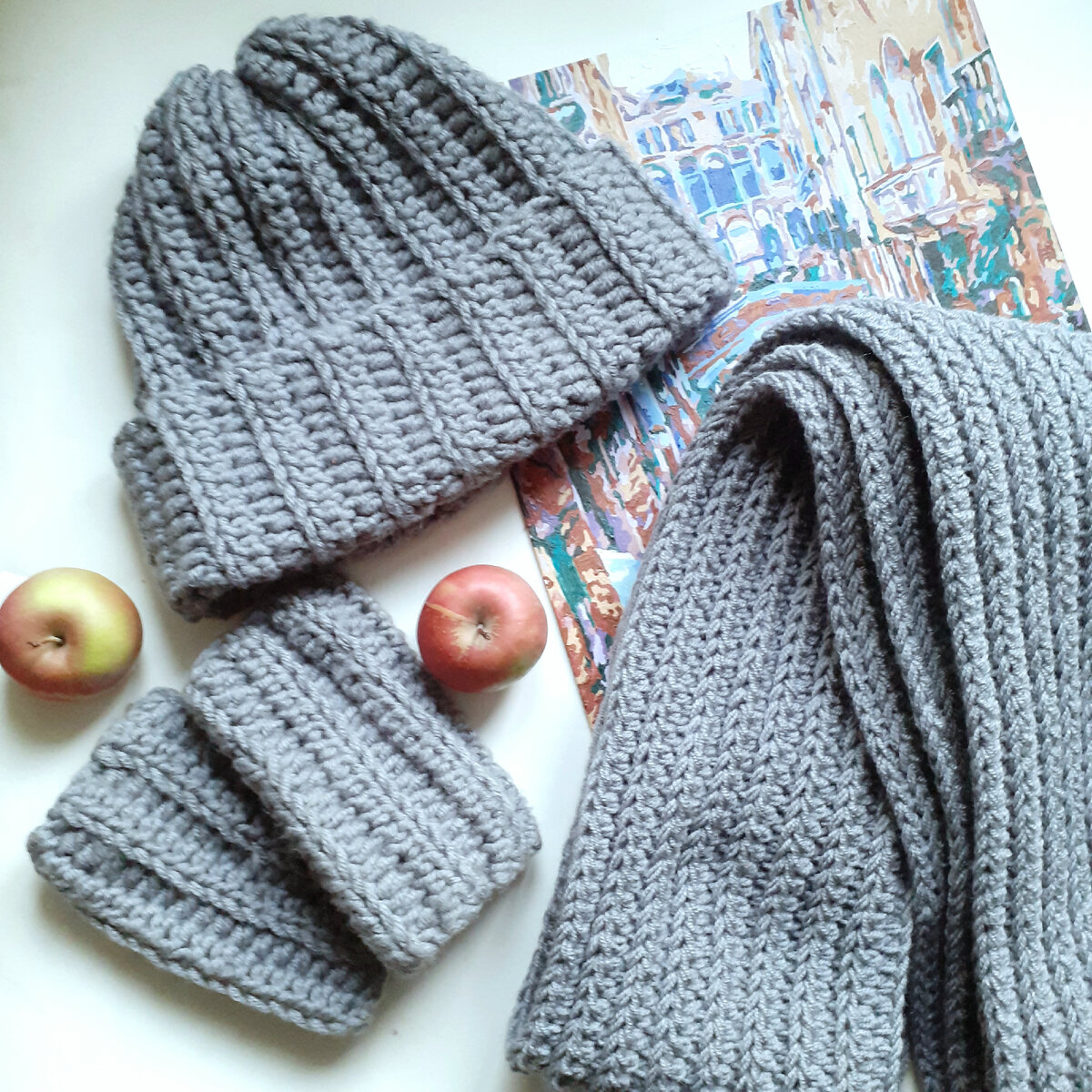 На самом деле, что там и вязать?.. Шапка - вечер, митенки - полчаса, шарф - вечер. Дело в том, что шапочка с митенками были связаны в январе этого года, а шарф - в декабре.